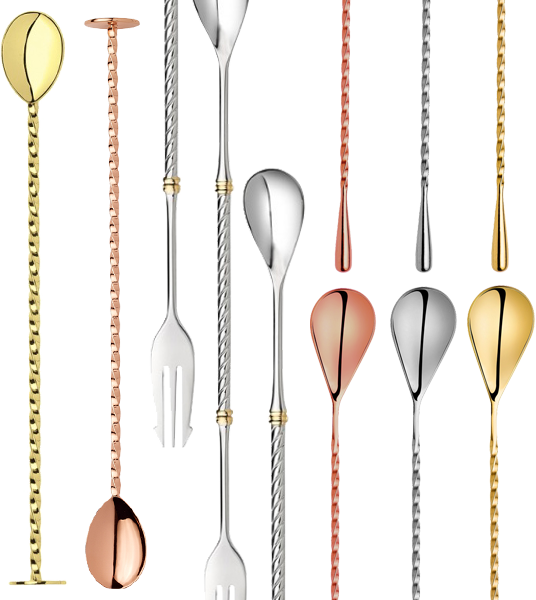 Lumian Trident Barspoon has a spiral handle with a trident fork on its opposit side. Comes in 5 differently plated models.